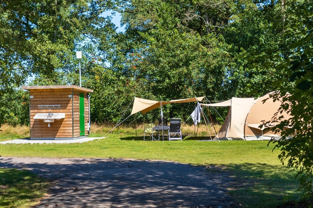 Rustige natuurcamping op de Veluwe, met ruime kampeerplaatsen, privé sanitair en directe toegang tot het bos.